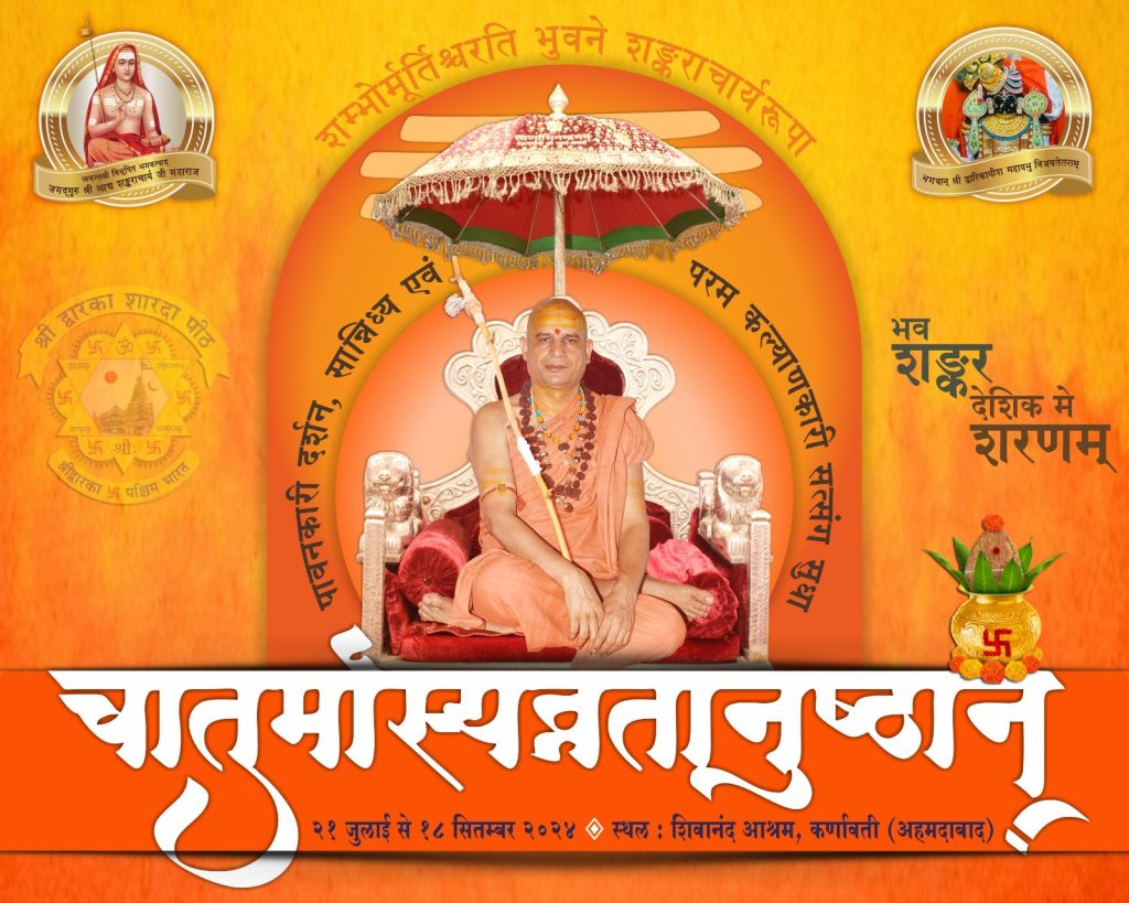 श्रीधाम / गोटेगांव (बी डी सोनी)। अनन्तश्रीविभूषित पश्चिमाम्नाय द्वारकाशारदापीठाधीश्वर जगद्गुरु शङ्कराचार्य स्वामिश्री सदानन्द सरस्वती जी महाराज श्री का 22वां चातुर्मास्यव्रतानुष्ठान भगवान् श्री चन्द्रमौलीश्वर एवं भगवान् श्री द्वारिकाधीश जी की अहैतुकी कृपा प्रसाद एवं अनंतश्रीविभूषित द्वीपीठाधीश्वर जगद्गुरु शङ्कराचार्य ब्रह्मलीन स्वामिश्री स्वरूपानन्द सरस्वतीजी महाराज के अमोघ शुभाशीर्वाद रूप, अनन्तश्रीविभूषित पश्चिमाम्नाय द्वारका शारदापीठाधीश्वर जगद्गुरु शङ्कराचार्य स्वामिश्री सदानन्द सरस्वती जी महाराजश्री का वि. सं. २०८१ का चातुर्मास-व्रत-अनुष्ठान गुजरात के (कर्णावती) अर्थात् अहमदाबाद स्थित शिवानंद आश्रम में होने जा रहा हैं। और इस चातुर्मासान्तर्गत पूज्यपाद महाराजश्री के दिव्य दर्शन, कल्याणकारी सत्संग एवं पावन सान्निध्य प्राप्त होगा आप सभी भक्तगण इस पुनीत पावन अवसर का अधिक से अधिक लाभ प्राप्त करे। गुरुदेव का चातुर्मास शिवानन्द आश्रम, सैटेलाइट रोड, इसरो के सामने {कर्णावती अहमदाबाद} पर होगा।