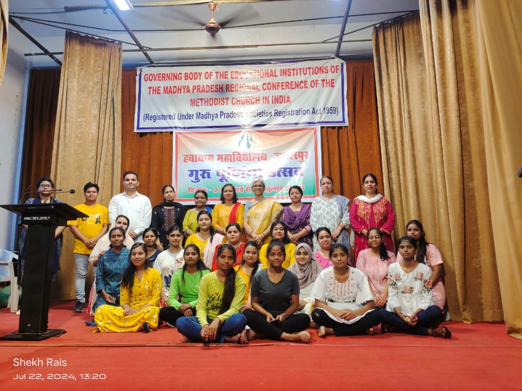 जबलपुर। मध्यप्रदेश शासन, उच्च शिक्षा विभाग, भोपाल के आदेशानुसार हवाबाग महाविद्यालय जबलपुर में गुरु पूर्णिमा उत्सव के द्वितीय दिवस के पावन अवसर पर दिनांक 22 जुलाई 2024 को गुरु वंदना कार्यक्रम के साथ व्याख्यान, भाषण, कविता, एवं सांस्कृतिक नृत्य आयोजित हुआ। गुरु पूर्णिमा उत्सव कार्यक्रम महाविद्यालय प्रबंधक श्रीमती लक्ष्मी छाया सिलास, प्राचार्य डॉ.शहवार सैयद एवं वरिष्ठ प्राध्यापक प्रो.आलोक चंसोरिया के मार्गदर्शन एवं डॉ.हिमानी उपाध्याय के नेतृत्व में आयोजित हुआ। कार्यक्रम के प्रथम चरण में प्रो.आलोक चंसोरिया नें गुरु पूर्णिमा के अवसर पर भारत की गौरवशाली गुरु शिष्य परम्परा के विषय में धर्म एवं सत्यनिष्ठा के माध्यम से सत्काम करने के लिए विद्यार्थियों कों प्रेरित किया।