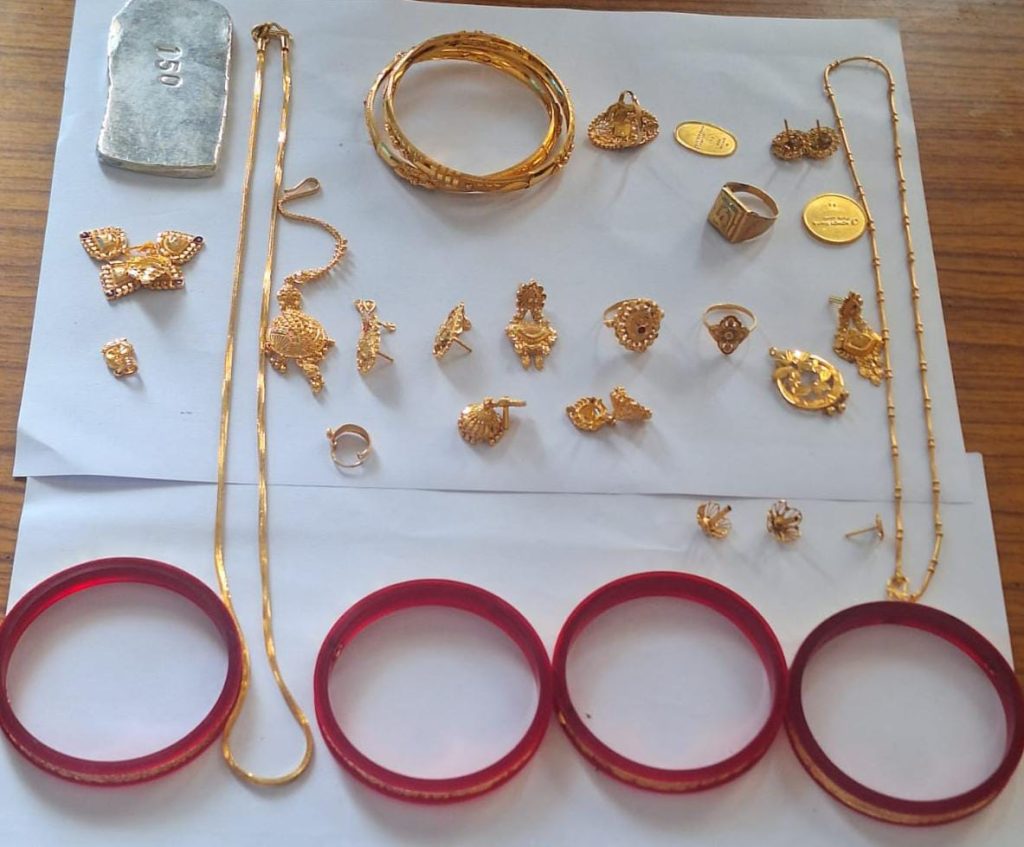 चुराये हुये 86 ग्राम सोने के जेवर एवं 150 ग्राम वजनी गली हुई चांदी तथा घटना मे प्रयुक्त 2 मोटर सायकिल एवं 3 मोबाईल जप्त