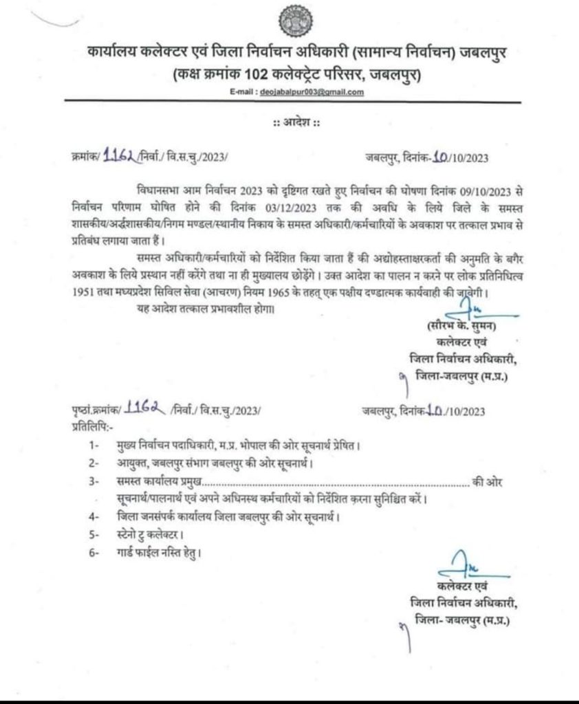 न्यूज लाइफ/जबलपुर। जिला निर्वाचन अधिकारी एवं कलेक्टर सौरभ कुमार सुमन ने विधानसभा चुनाव की प्रक्रिया पूरी होने तक जिले में पदस्थ शासकीय, अर्द्ध शासकीय, निगम, मण्डल एवं स्थानीय निकायों के सभी अधिकारियों-कर्मचारियों के अवकाश पर तत्काल प्रभाव से रोक लगा दी है ।